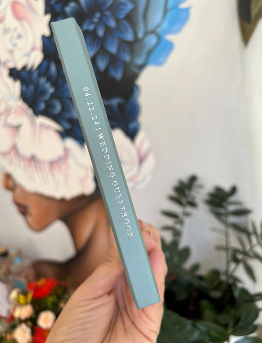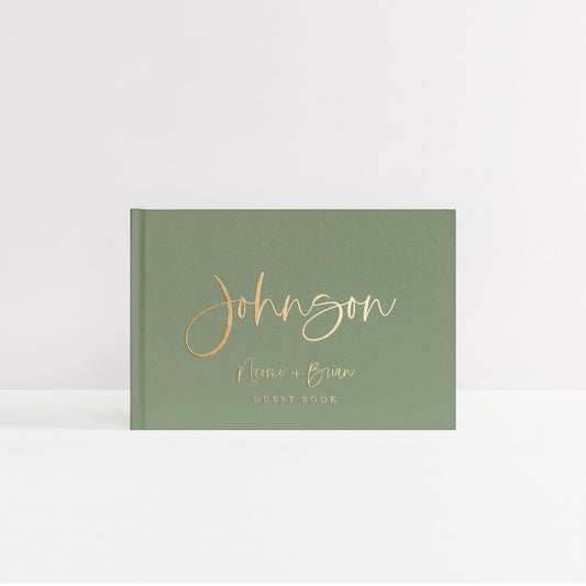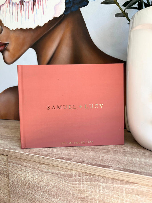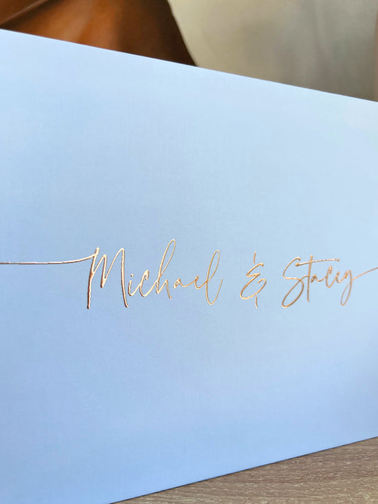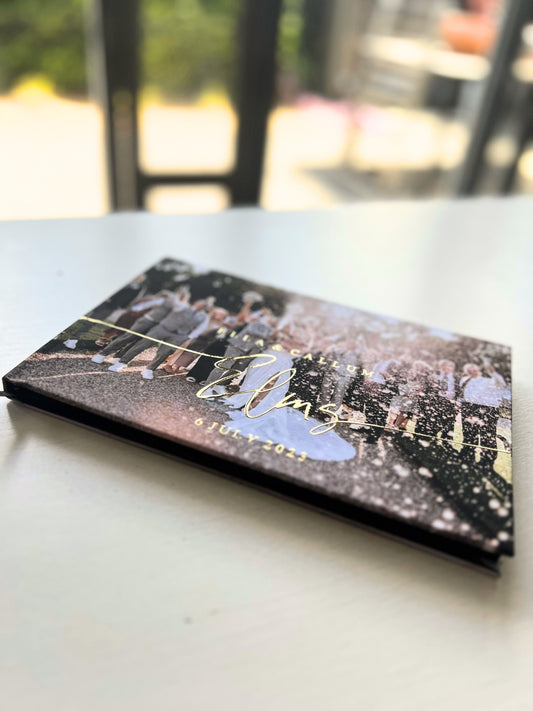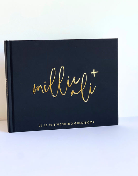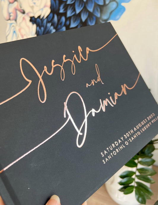Our soft-touch hardcover wedding guest books are printed with real foil and can be personalized with your own text to make the book extra meaningful. We offer three sizes, 50 or 100 sheets of paper, and your choice of colours to coordinate with your wedding theme. Interior paper can be blank white to allow guests the space to share whatever they like, traditional white lined paper, or blank black paper for a more unique look.